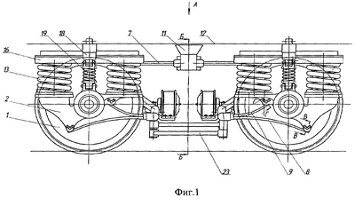 Вторая ступень рессорного подвешивания связывает кузов 12 с буксами 2 и состоит из четырех комплектов двухрядных пружин 13. Каждая двухрядная пружина 13 состоит из наружной пружины 14 и внутренней пружины 15. Верхняя обойма 16 пружин 13 выполнена перекатывающегося типа с ножевым элементом. Кузов 12 передает нагрузки через опору 17, поверхность сочленения которой с обоймой 16 выполнена с радиусом. Для демпфирования вертикальных колебаний кузова 12 предусмотрен гидравлический гаситель 18 колебаний с последовательно включенной пружиной 19, что обеспечивает снижение высокочастотных возмущений, передаваемых от букс 2 колесных пар 1. Демпфирование горизонтальных колебаний выполнено гасителями 20.