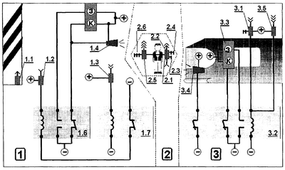Радиопередатчик 1.1 передает, а радиоприемник контроля опасной зоны 1.2 воспринимает его сигнал. Этот принимаемый сигнал управляет работой транзистора (на схеме радиоприемника 1.2 не показан), т.е. принимая этот сигнал, транзистор «открывается» и через него подается питание («плюс» источника) на обмотку возбуждения реле контроля опасной зоны 1.6. «Минус» питания обмотки возбуждения реле 1.6 подается через нормально замкнутый контакт реле контроля зоны приближения 1.7. При этом через нормально разомкнутый контакт реле 1.6 подается питание светового (белый или зеленый) сигнала светофора 1.5, разрешающего движение маневрового локомотива. В режиме осуществляется постоянный контроль за работоспособностью блока 1. Так, при любом нарушении работы радиопередатчика 1.1 радиоприемник 1.2, не получая радиосигнала, обесточит реле 1.6, что вызовет переключение светофора 1.5 на запрещающий (красный или синий, в зависимости от используемого светофора) сигнал и подачу звукового сигнала 1.4.