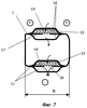 На фиг.10 представлена схема продольного сечения полого участка пустотелого силового элемента кузова (в частности, порога пола кузова), герметично ограниченного на концах двумя акустическими заглушками, содержащего с внешней стороны порога пола (со стороны дорожного покрытия) трубчатый дренажный эжектирующий канал, повышающий звукоизоляцию канала связи между пространством пассажирского салона (кабины) и зашумленным пространством под полом кузова и обеспечивающий при этом эвакуацию образующегося конденсата из полости силового элемента кузова, за счет эжектирующего эффекта, вызванного перепадами давлений воздуха по обеим сторонам стенок концевых участков канала. С внутренней стороны порога пола (со стороны пассажирского салона), на внутренней и внешней поверхностях его верхней стенки, установлены спаренные, с общей разделительной перегородкой, трубчатые перепускные воздушные каналы, по крайней мере, один из которых интегрирован с пористой воздухопроницаемой вставкой поглотителя высокочастотного звука, дополнительно повышающие звукоизоляцию канала связи между пространством пассажирского салона (кабины) и зашумленным пространством под полом кузова за счет введения звукоизолирующих перегородок со смещенными осями отверстий относительно дренажного отверстия 10 и введения общей разделительной перегородки, содержащей, в свою очередь, промежуточное отверстие 15 со смещенной осью относительно отверстий 9 и 14, образующих комбинированную сообщающуюся двухкамерную систему расширительных шумозаглушающих камер.