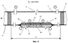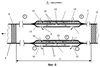 На фиг.6 представлена схема продольного сечения полого участка пустотелого силового элемента кузова (в частности, порога пола кузова), герметично ограниченного на концах двумя акустическими заглушками, содержащего с внешней стороны порога пола (со стороны дорожного покрытия) и с внутренней стороны порога пола (со стороны пассажирского салона), на внутренней и внешней поверхностях его стенок – спаренные, с общей разделительной перегородкой, трубчатые перепускные воздушные каналы и дренажные эжектирующие каналы, по крайней мере, один из которых интегрирован с пористой воздухопроницаемой вставкой поглотителя высокочастотного звука, дополнительно повышающие звукоизоляцию канала связи между пространством пассажирского салона (кабины) и зашумленным пространством под полом кузова за счет введения звукоизолирующих перегородок и введения общих разделительных перегородок, содержащих, в свою очередь, промежуточное отверстие со смещенной осью относительно дренажных (перепускных) отверстий, образующих комбинированную сообщающуюся двухкамерную систему расширительных шумозаглушающих камер. При этом, обеспечивается эвакуация образующегося конденсата из полости силового элемента кузова, за счет эжектирующего эффекта, вызванного перепадами давлений воздуха по обеим сторонам стенок концевых участков дренажных эжектирующих каналов.