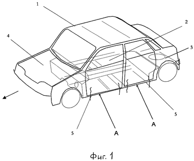 1 – кузов транспортного средства (легковой автомобиль), содержащий коробчатые сечения силового каркаса;