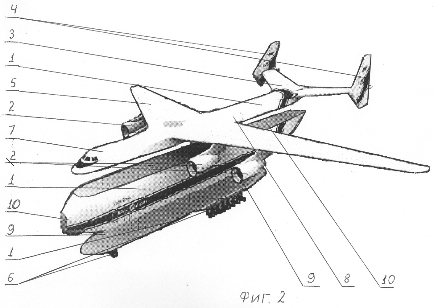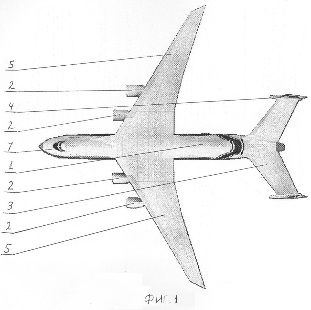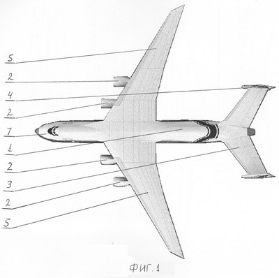 Вариационный летательный аппарат, выполненный большой вместимостью с возможностью использования в грузовом, в пассажирском и грузопассажирском вариантах, содержащий фюзеляж 1 (фиг.1), силовые установки 2 (фиг.1-3) для двигателей (не показаны), стабилизатор 3 (фиг.1-3), киль 4 (фиг.1-3), крыло 5 (фиг.1-3), шасси 6 (фиг.2, 3), кабину летного экипажа 7 (фиг.1-4), системы и оборудование (не показаны) и элементы систем (не показаны), контактирующих с аэродромом и средствами наземного обслуживания (заправщиками систем, наземными энергетическими источниками, тягачами, трапами и т.п.).