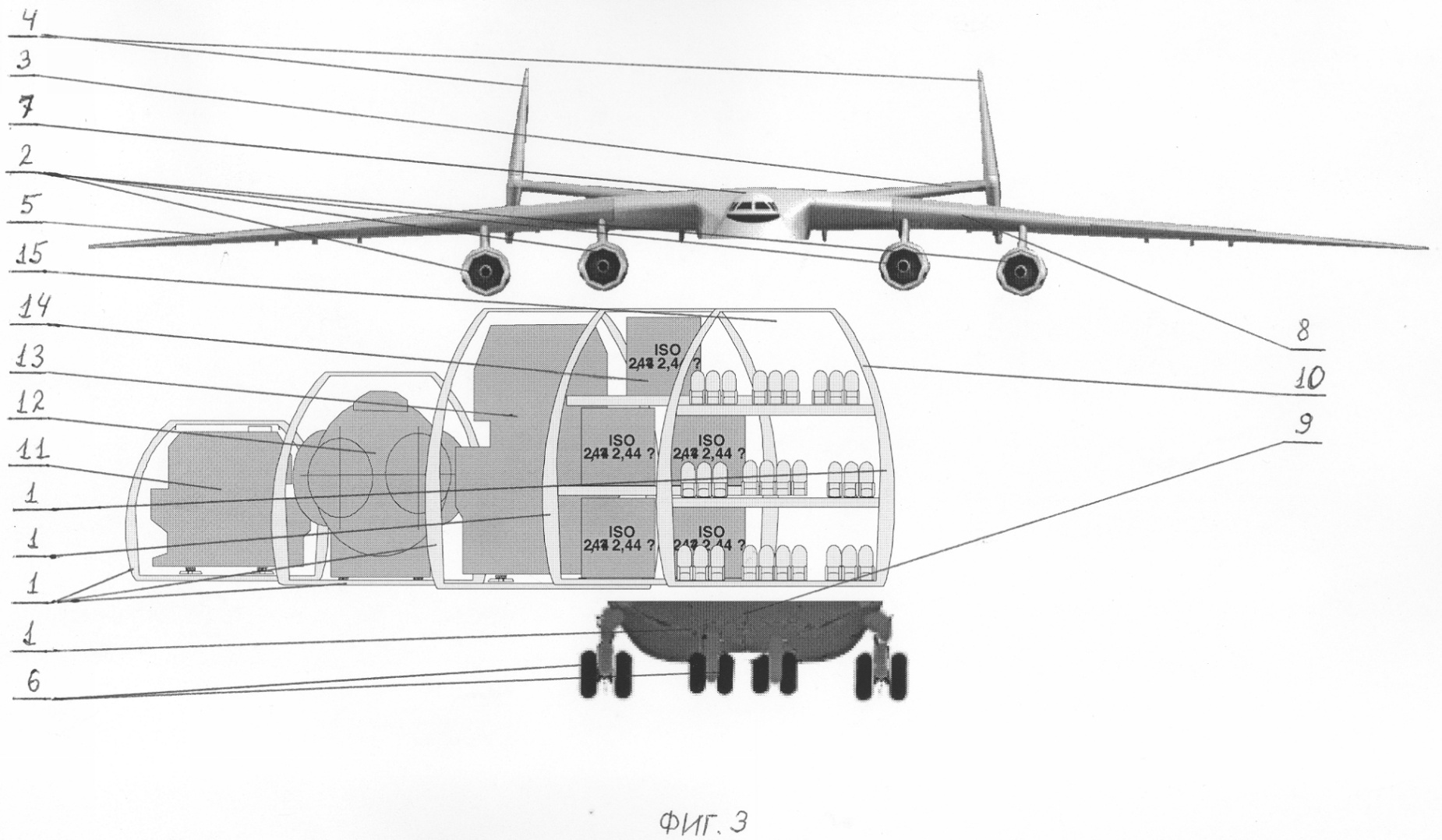 1. Вариационный летательный аппарат, содержащий фюзеляж со смонтированными на нем силовыми установками, стабилизатор, киль, крылья, шасси, кабину летного экипажа, системы и оборудование, причем летательный аппарат выполнен большой вместимостью, с возможностью использования в грузовом, пассажирском и грузопассажирском вариантах, отличающийся тем, что вариационный летательный аппарат выполнен компоновочно разделенным на специализированные функциональные модули, включающие первый – верхний – летно-технический модуль, второй – нижний – взлетно-посадочный модуль и третий – средний – функционально-целевой модуль, причем первый модуль включает упомянутые стабилизатор, киль, крыло, силовые установки, все основные системы и оборудования, кабину летного экипажа, кабины обслуживающего персонала и верхний отсек фюзеляжа, объединяющий этот модуль в единый блок, обеспечивающий полет авиалайнера и его летные характеристики, при этом упомянутый второй модуль включает органы приземления и разбега – шасси, элементы систем, контактирующих с аэродромом и средствами наземного обслуживания, и нижний отсек фюзеляжа, объединяющий этот модуль в единый блок, обеспечивающий контакт летательного аппарата с землей, а упомянутый третий модуль включает целевую кабину, определяющую назначение летательного аппарата, и средний отсек фюзеляжа, объединяющий этот модуль в единый блок, обеспечивающий функциональное назначение летательного аппарата и его потребительские свойства, с возможностью формирования летательного аппарата конкретного назначения, путем установки между упомянутыми первым и вторым модулями в процессе производства функционально-целевого модуля как грузового модуля для генеральных грузов или грузового модуля для крупногабаритных, но легких грузов, или грузового модуля для тяжелых монолитных грузов, или пассажирского модуля различной компоновки, или специального модуля узкого целевого назначения.