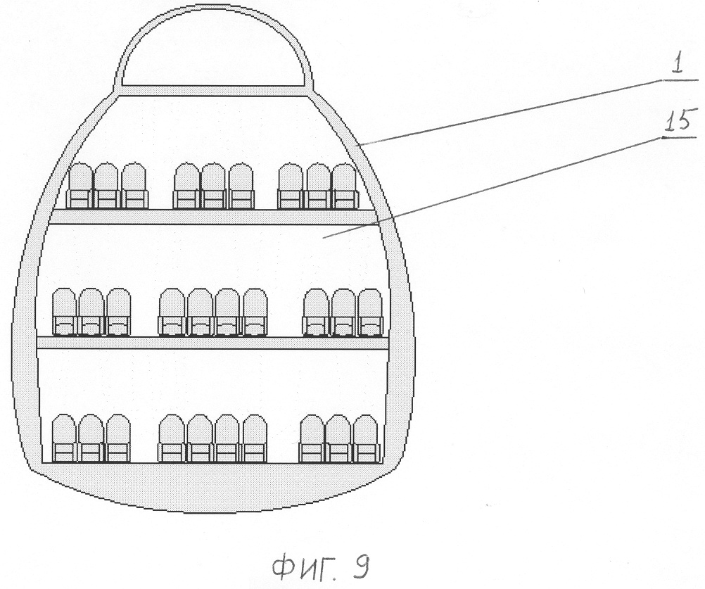 Вариационный летательный аппарат снабжен комплектом третьих – средних – функционально-целевых модулей 10 (фиг.3, 5-9), содержащим грузовой модуль для генеральных грузов 11 (фиг.3, 5), грузовой модуль для крупногабаритных, но легких грузов 12 (фиг.3, 6), грузовой модуль для тяжелых монолитных грузов 13 (фиг.3, 7), грузовой модуль по габаритам или массе грузов 14 (фиг.3, 8), пассажирские модули различной компоновки 15 (фиг.3, 9), специальные модули узкого целевого назначения и другие модули (не показаны).