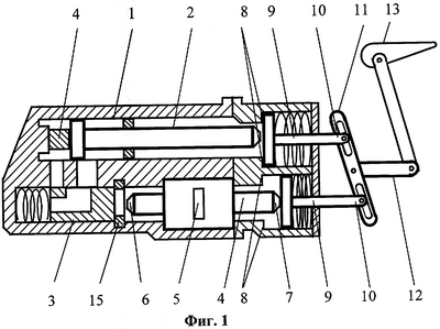 Изображенный на фиг.1, 2 следящий электрогидравлический привод содержит гидравлический цилиндр 1 с силовым штоком 2, золотник 3 и линейный электропривод (электродвигатель на чертеже не приведен) со штоком 4 для перемещения золотника 3. Передача от линейного привода к штоку 4 осуществляется роликовинтовой передачей 5. Силовой шток 2 гидравлического цилиндра 1 и шток 4 линейного электропривода оснащены датчиками положения (на чертеже не приведены), выходные сигналы которых подключены к входам контроллера управления (на чертеже не приведен) линейным электроприводом. Линейный электропривод имеет первый выход 6 штока 4 для управления золотником 3 и второй выход 7 штока 4, со стороны которого расположен снабженный упорами 8 подпружиненный приводящий шток 9. Такой же снабженный упорами 8 подпружиненный приводящий шток 9 расположен и со стороны силового штока 2 гидравлического цилиндра 1. Оба приводящих штока 9 свободными концами 10 посредством кулисы (коромысла) 11 соединены с тензометрированной тягой 12, управляющей аэродинамической поверхностью (рулем) 13. Золотник 3, взаимодействующий с первым выходом 6 штока 4, выполнен подпружиненным. Шток гидроцилиндра 1 имеет упор 14. Ход золотника 3 ограничен упором 15.
