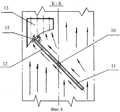 При изменении регулятором расхода и температуры количества продувочного воздуха, например повороте заслонки 9 на закрытие для уменьшения количества продуваемого воздуха, на ней в момент движения создается на передней поверхности выходного крыла 12 уплотнение воздуха, а на задней поверхности – разрежение. Это вызывает срыв потока с кромки заслонки при перетекании потока в разреженную зону, образуются вихри. На другом – входном крыле 11 заслонки картина давления противоположная: мгновенное повышение давления создается на задней его поверхности. Если не устранить воздействие вихрей на выходное крыло заслонки, то они вызовут динамические нагрузки на нее. Они могут при известных соотношениях находиться в условиях акустического резонанса и таким образом служить причиной интенсивной вибрации как заслонки, так и ее крыльев. Поскольку передняя поверхность канального разделителя выполнена эквидистантной профилю кромки выходного крыла заслонки во всех ее положениях и расположена на небольшом (2 миллиметра) расстоянии от нее, воздушный поток с вихрями в начальной стадии, истекая с кромки выходного крыла 12, разделяется по каналам и изменяет свои характеристики. На задней поверхности заслонки 9 воздух из зоны повышенного давления за входным крылом 11, перетекая в зону пониженного давления за выходным крылом 12, сдувает вихри в каналы разделителя. Таким образом, стабилизатор потока, выполненный в виде канального разделителя, устраняет воздействие мгновенных завихрений воздушного потока на заслонку.