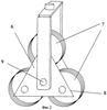 Для облегчения перемещения контейнера через наиболее часто встречающиеся препятствия (ступени, пороги и т.д.) ходовая часть контейнера выполнена в виде нескольких блоков колес 3, каждый из которых представляет собой пластины 6 в форме равностороннего многоугольника (выбран треугольник) с колесами 7, оси 8 которых закреплены вблизи его вершин и осью 9 в центре, причем радиусы колес и размеры сторон многоугольника подбираются таким образом, чтобы при столкновении с препятствием (например, ступенью лестницы) вышестоящее колесо при условии поворота пластин 6 блока на оси 9 в направлении движения оказалось над препятствием, чем обеспечивается подъем оси блока 9 и преодоление препятствия. При столкновении со следующим препятствием последовательность работы такая же, что позволяет преодолевать лестничные марши (фиг.3).