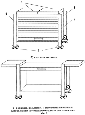 2. Устройство для транспортирования противопожарного и аварийно-спасательного оборудования, эвакуации материальных ценностей и пострадавших людей, представляющее собой контейнер для оборудования, с возможностью размещения на транспортном средстве, и имеющий собственную ходовую часть, отличающееся тем, что массогабаритные параметры контейнера, с учетом размещаемого в нем оборудования, подобраны таким образом, что позволяют перемещать его мускульной силой одного человека по горизонтальным и наклонным поверхностям или двух человек – по лестничным маршам, а также размещать его в лифтах, клетях, дверных проемах, на лестничных маршах, эскалаторах, трапах, пандусах, причем для обеспечения эвакуации людей в верхней части контейнера предусмотрены шарнирно- закрепленные полотна, которые при раскладывании образуют вместе с верхней частью контейнера поверхность для размещения человека.