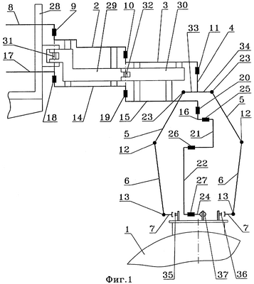 Кроме того, последнее звено горизонтального перемещения трубопровода подачи жидкого продукта может разветвляться как минимум на два трубопровода, каждый из которых шарниром с горизонтальной осью соединен со звеньями вертикального перемещения, связанными с наливным патрубком.