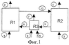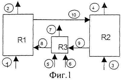 В первую реакционную зону (R1) подают воду (линия 1) и получают Н2 (линия 2). Во вторую реакционную зону (R2) подают метан (линия 3), и образуются продукты его сгорания: диоксид углерода и вода (линия 4). В дополнительный блок (R3) поддержания температуры подают совместно водород (линия 5) и воздух (линия 6); при этом получают H2О и азот (линия 7).
