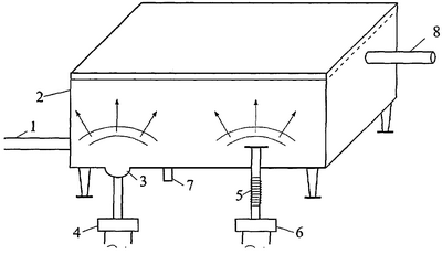 Вода, подлежащая обработке, по трубопроводу 1 (см. чертеж) поступает в накопительную емкость 2, в днище которой установлена параболическая камера 3, электроды из которой подключены к источнику импульсного тока 4. В днище установлен также излучатель (магнитострикционного типа) ультразвуковых колебаний 5, подключенный к импульсному ультразвуковому генератору 6. Для периодического удаления воды смонтирован вентиль 7, обработанная вода передается в теплообменную аппаратуру или другое производство по трубопроводу 8.