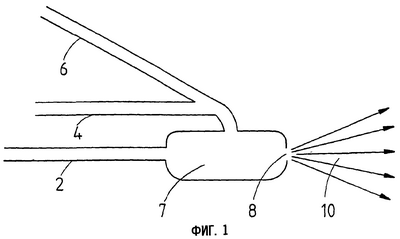 На фигуре 1 с камерой 7, соседствующей с распылительным соплом 8, соединяются три линии 2, 4 и 6. Предварительно смешанные эмульсию и цемент подают по линии 2, воздух подают по линии 4, где его смешивают с ускорителем схватывания (если таковой используется) из линии 6 перед введением в контакт со смесью эмульсия/цемент. Из распылительного сопла испускается струя 10, содержащая смесь цемент/эмульсия, воздух и ускоритель схватывания.