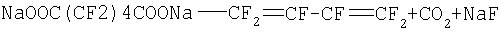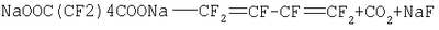 – Декарбоксилированием динатриевой соли октафторадипиновой кислоты (1) по схеме с выходом 30% (2). К недостаткам способа относятся низкий выход целевого продукта и загрязненность трудноотделимыми примесями.