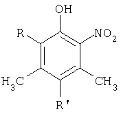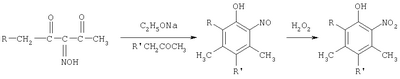 Реакцию проводят следующим образом. В 20 мл абсолютного этилового спирта растворяют 0,04 моль (0,92 г) натрия. Далее в спиртовый этилат натрия добавляют 0,1 моль (1,43 г) изонитрозопропионилацетона и 0,072 моль (4,1 мл) ацетона. По прошествии 3 часов при механическом перемешивании прикапывают 5 мл 15% перекиси водорода так, чтобы температура реакции не превышала 40°С. Через 2 часа смесь подкисляют разбавленной соляной кислотой до рН 4-5 и отгоняют продукт реакции с водяным паром. Выход 3,4,5-триметил-2-нитрофенола составил 62% от теоретического, tпл=96°C. Литературная tпл=96-98°С [Словарь органических соединений, т.3, Изд. ин. лит., M., 1949]. Примеры 12-15. Аналогично примеру 3. Условия проведения реакции и выход продукта приведены в таблице 3.