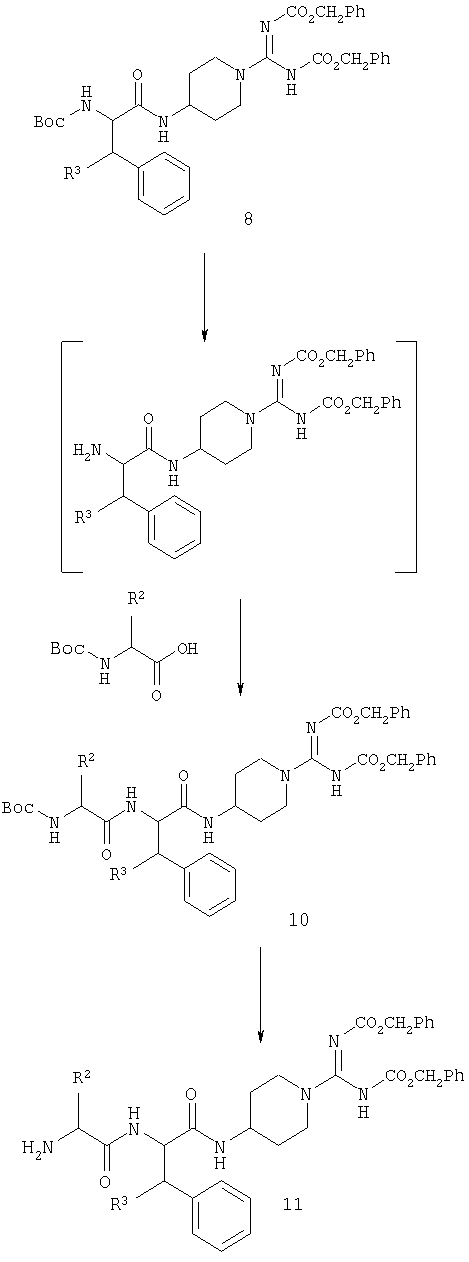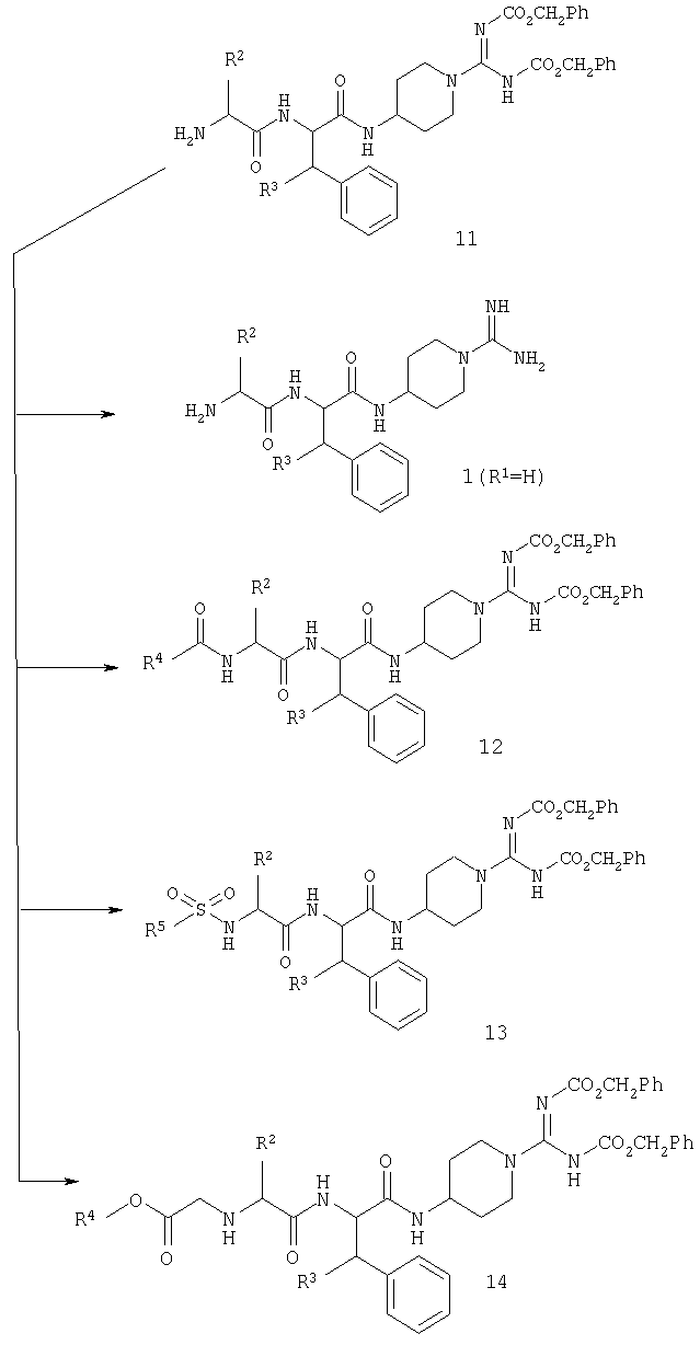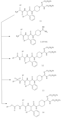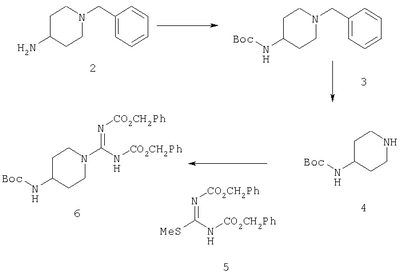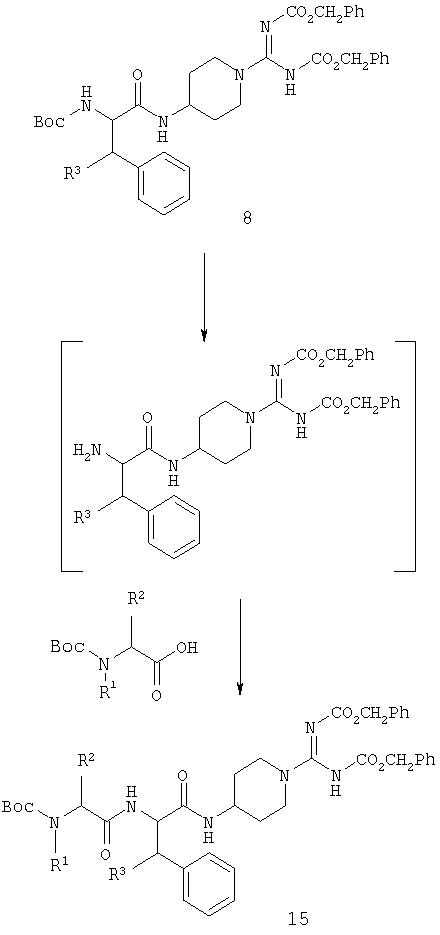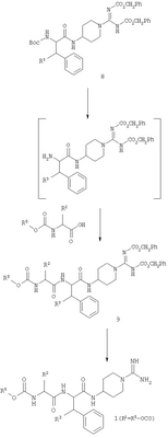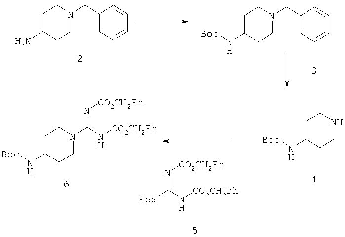 Соединения по настоящему изобретению могут быть получены способами, широко известными из уровня техники, и особенно способами, используемыми в области химии пептидов. Пригодным исходным веществом является 4-амино-1-бензилпиперидин (2). В результате защиты первичного амина трет-бутилоксикарбонильной (Boc) группой получают соединение 3, гидрогенолиз которого приводит к производному пиперидина 4. Этот продукт может быть обработан производным изотиомочевины 5 с получением производного карбоксамидинопиперидина 6, в котором аминная и гуанидиновая функциональные группы защищены по-разному.