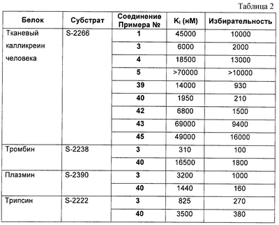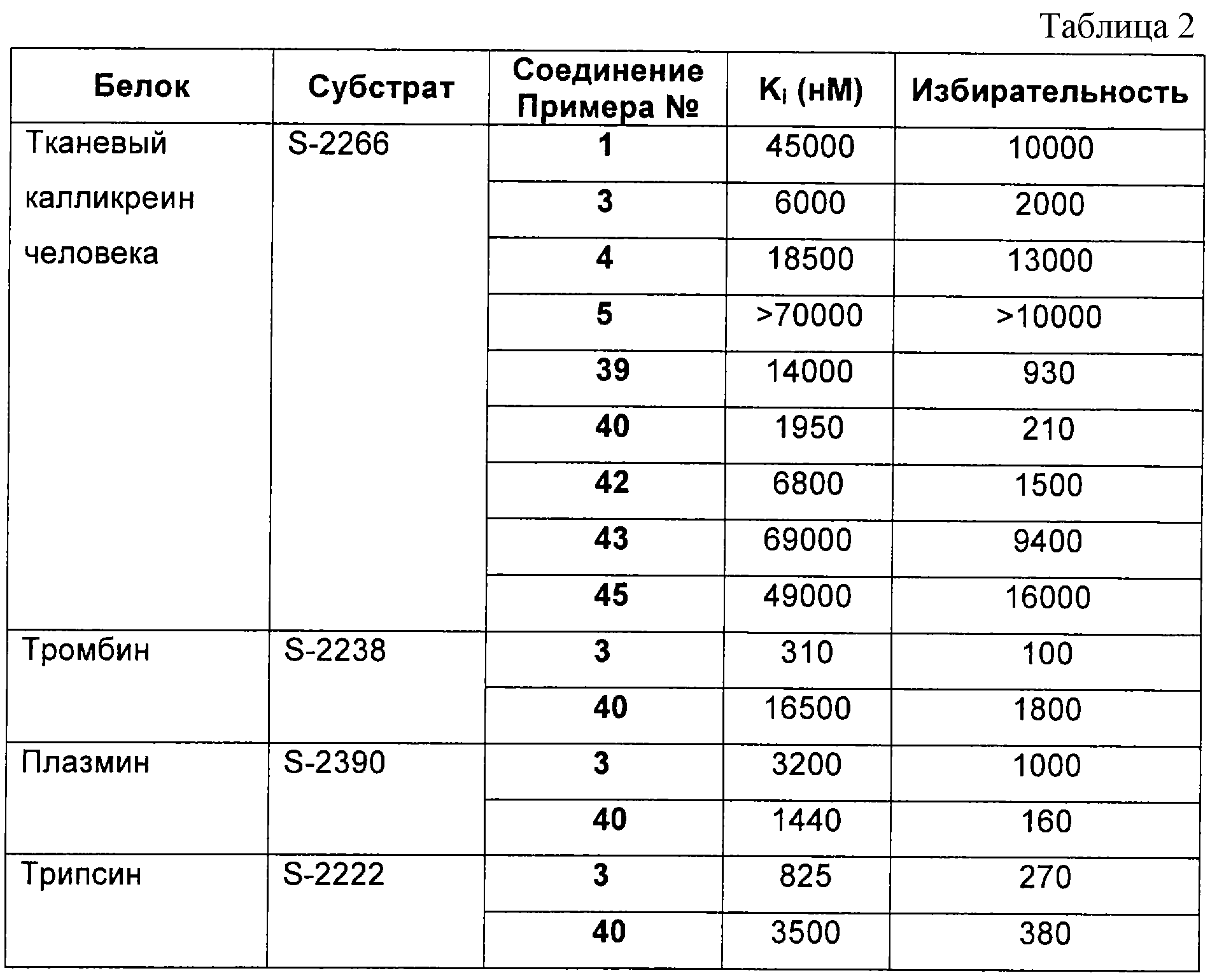 Был проведен дополнительный скрининг отобранных соединений на ингибиторную активность в отношении других трипсиноподобных протеаз, следуя методике из примера 59 и с использованием соответствующего фермента и хромогенного субстрата (Cromogenix AB). Показательные результаты представлены в Таблице 2. Избирательность определяется следующим образом: