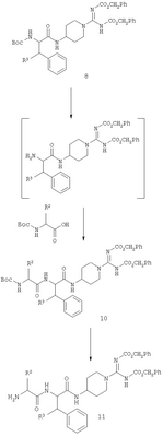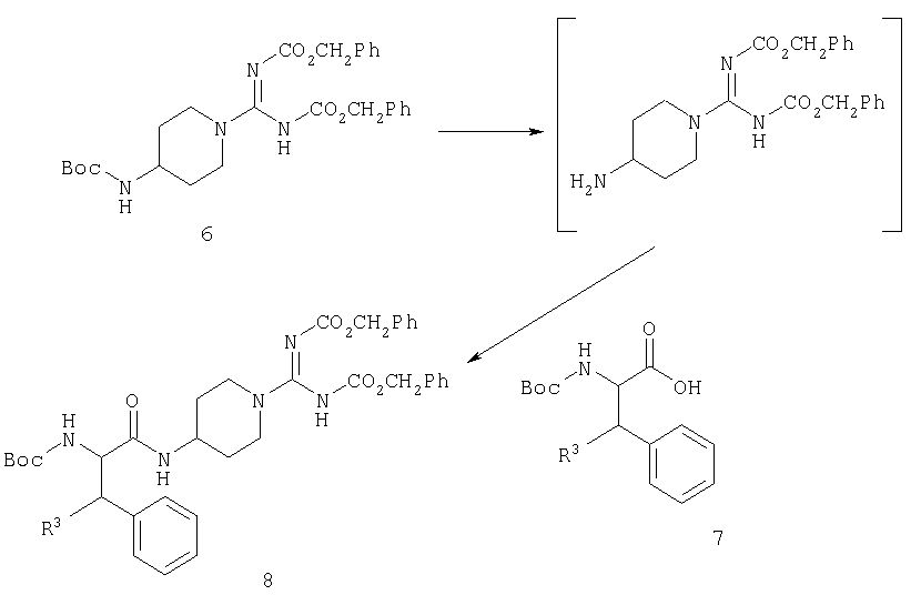 С производного карбоксамидинопиперидина 6 можно избирательно снять защиту и осуществить его сочетание с N-защищенной аминокислотой 7 с получением промежуточного соединения 8.