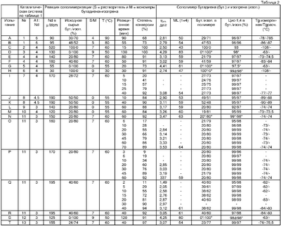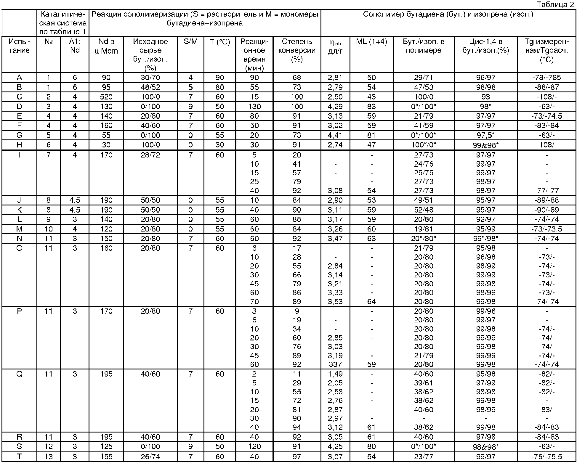 II. Сополимеризация бутадиена и изопрена с помощью вышеуказанных каталитических систем 1) Выполненные способы полимеризации Двадцать испытаний на полимеризацию, обозначенных А-Т в приведенной ниже таблице 2, выполнены с целью получения сополимеров бутадиена и изопрена, за исключением испытаний D, G и S, приводящих к гомополимерам изопрена, и испытаний С и Н, приводящих к гомополимерам бутадиена. Реакции полимеризации осуществляют либо в растворе (растворителем является циклогексан) для испытаний А, В, С, D, Е, F, I, N, О, Р, Q, R, S, Т, либо как реакции в массе для испытаний G, Н, J, К, L и М. Используют следующие реакторы для полимеризации: для испытаний С и D: “Steinie” бутыль на 250 мл, полимеризацию проводят в водяном баке; для испытаний Е, F, I, N, О, Р, Q, R, S, Т: реактор на 70 литров с рубашкой и системой перемешивания; для испытаний G, Н, J, К, L, М: реактор Вернера, состоящий из 2-литрового металлического бака с рубашкой и конденсатора, позволяющего регулировать давление в реакторе. Перемешивание осуществляют двумя лопастями, вращающимися в противоположных направлениях и с различными частотами вращения; для испытаний А и В: танк на 14 литров с рубашкой и системой перемешивания. Следует отметить, что испытания А и В связаны с непрерывными синтезами, тогда как все остальные – с периодическими синтезами. Используемый в качестве сомономера изопрен выделяют в лаборатории общепринятым способом из С5-фракции лигроина, полученной при крекинге водяным паром, путем перегонки указанной С5-фракции над малеиновым ангидридом для удаления остаточного циклопентадиена, последующим пропусканием через колонку с оксидом алюминия для удаления полярных примесей и барботирования азотом в течение 20 минут непосредственно перед реакцией полимеризации. Количество неодимовой каталитической основы варьируется в различных испытаниях на полимеризацию от 30 до 520 мкмоль на 100 г мономера (количество неодима далее указано в По окончании полимеризации добавляют ацетилацетон (в молярном соотношении ацетилацетон:неодим по существу равном 1:30 до 30:1) для обрыва реакции и добавляют N-1,3-диметилбутил-N’-фенилфенилендиамин (обозначенный 6PPD) в качестве защитного средства (в количестве 0,2 на 100 частей смолы). 2) Полученные результаты Для описания кинетики сополимеризаций измеряют скорость конверсии мономеров как функцию реакционного времени. Характеристическая вязкость Температуру стеклования Tg для каждого полученного полимера измеряют методом дифференциального энтальпиметрического анализа (DSC), используя дифференциальный калориметр, выпускаемый под маркой “METTLER TOLEDO STAR SYSTEM”. Микроструктуру полученных полимеров определяют, используя либо анализ 13С-ЯМР (ядерный магнитный резонанс по углероду-13, абсолютный метод с ошибкой измерения 0,1%, отмеченный * в приведенной ниже таблице 2) или NIR анализ (в инфракрасной, ближней зоне, используемый для всех остальных измерений). Указанные методы дают возможность установить содержание звеньев бутадиена и изопрена вместе с содержанием цис-1,4 связи. Первый 13С-ЯМР аналитический метод осуществляют, используя промышленно выпускаемый “BRUKER AM250” спектрофотометр. Второй метод NIR-анализа осуществляют, используя промышленно выпускаемый “BRUKER IFS25” спектрофотометр при гармонической вибрации и интервале комбинаций, отвечающих полимерным образцам, ранее кали