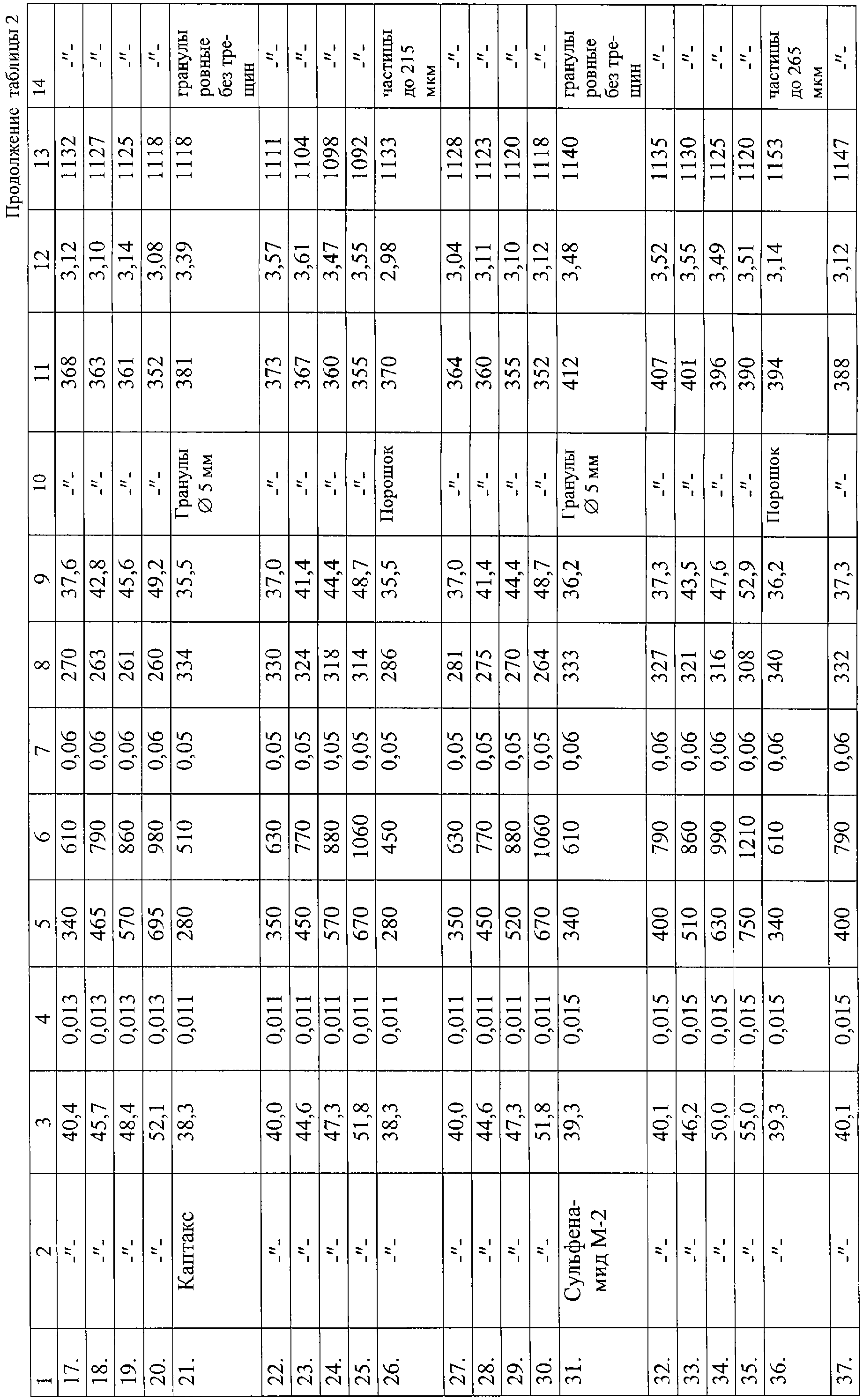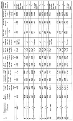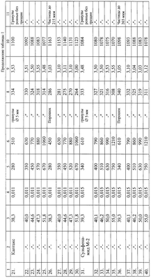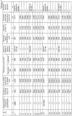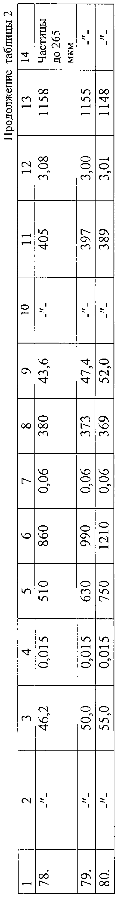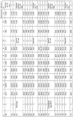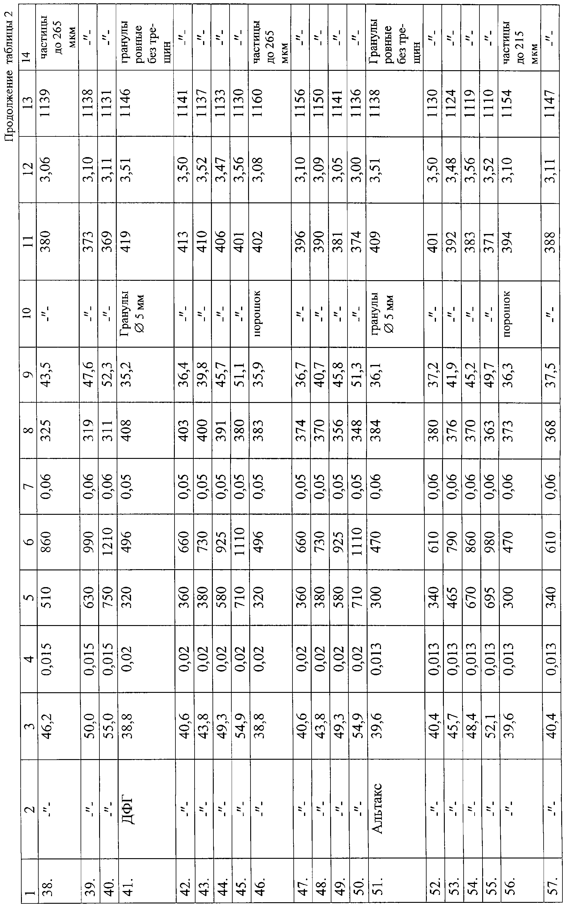 В примерах 1-40 таблицы 2 каждую порцию пастообразной массы раздельно пропускали через гранулятор после смешения пасты с сыпучим продуктом насыпной плотности из порций 1-40 таблицы 1 и далее все действия в примерах 1-5, 11-15, 21-25, 31-35 таблицы 2, аналогично примерам 1-5, 11-15, 21-25, 31-35 таблицы 1, а в примерах 6-10, 16-20, 26-30, 36-40 таблицы 2 аналогично примерам 6-10, 16-20, 26-30, 36-40 таблицы 1.