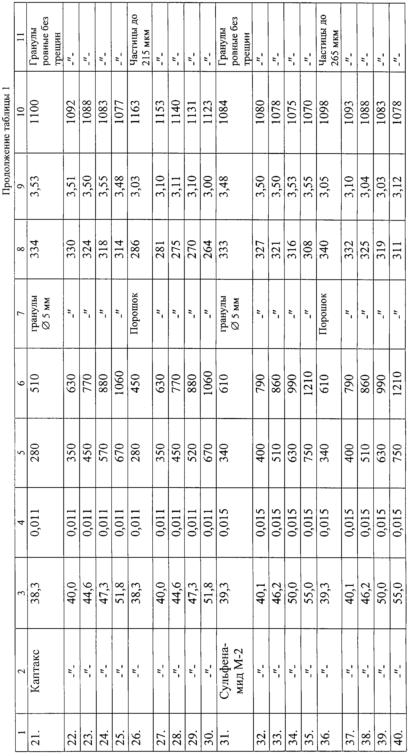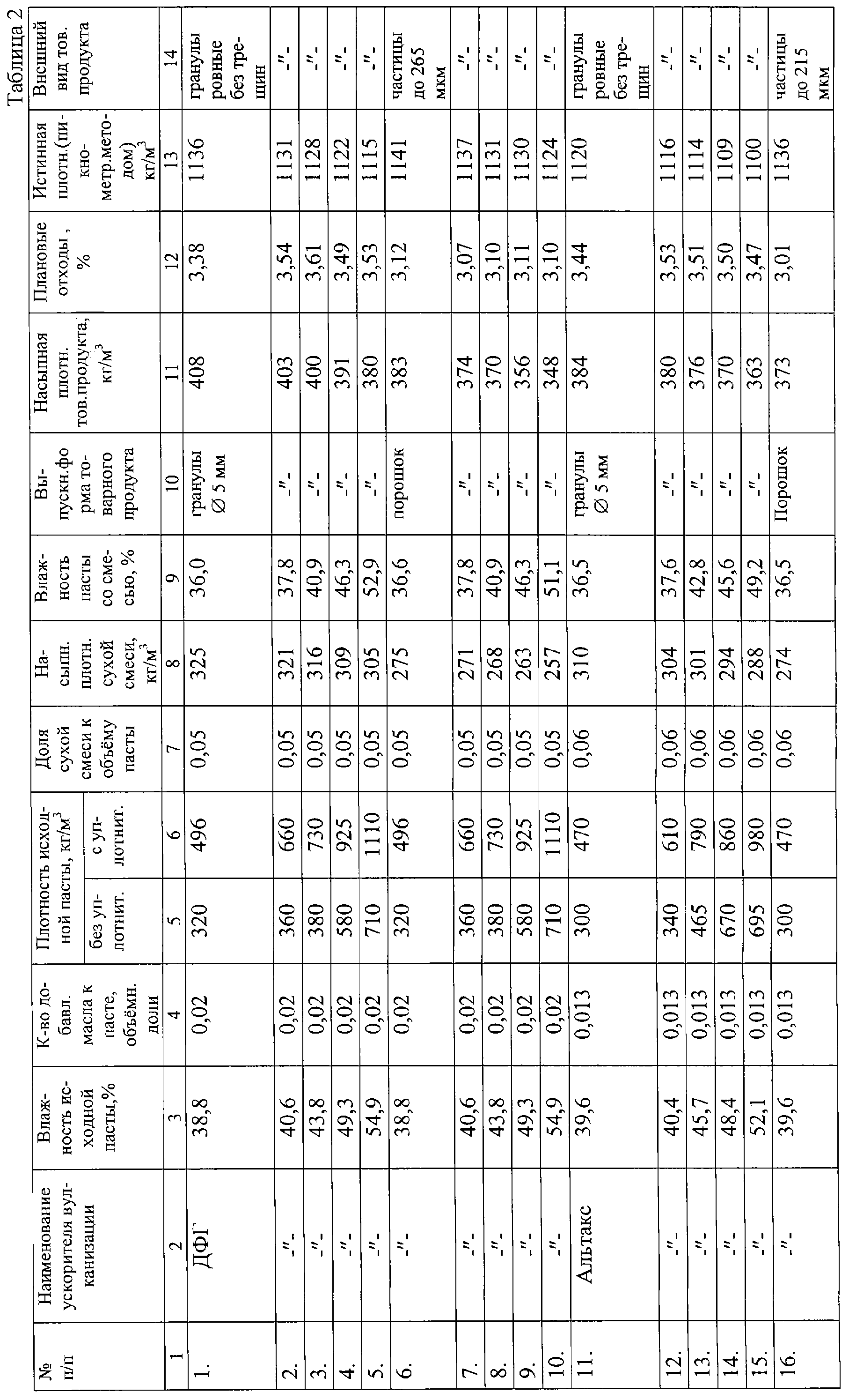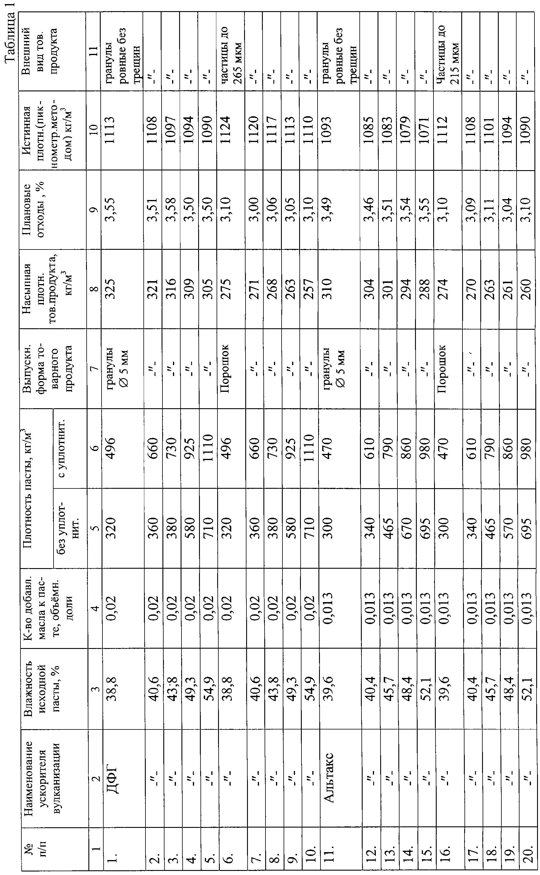 Получили по известной технологии водные растворы суспензий ДФГ, альтакса, каптакса, сульфенамида М-2, которые отфильтровали на барабанном вакуум-фильтре и отжали в виде пасты в смеси с минеральным маслом КС-19 (Гост 9243-75) в количестве 0,01 доли объёма гранулируемой пастообразной массы. Отделили по 6 порций пастообразного материала объемом по 1000 мл каждого продукта с номиналами влажности: ДФГ – 54,9%, 49,3%, 43,8%, 40,6%, 38,8%; альтакс – 52,1%, 48,4%, 45,7%, 40,4%, 39,6%; каптакс – 51,8%, 47,3%, 44,6%, 40,0%, 38,3%; сульфенамид М-2 – 55,0%, 50%, 46,2%, 40,1%, 39,3%. В каждой порции замерили значения плотности пастообразного материала по ИСО 1064-74 Гост 29190-91. Все 30 порций каждого материала разделили на 3 группы, а каждую группу разделили на 2 подгруппы, в каждую из которых вошло по 1000 мл отобранной пасты каждого номинала влажности. Все порции пастообразной массы раздельно пропускали через шнековый экструдер с диаметром фильерной решетки 5,0 мм. В примерах 1-5, 11-15, 21-25, 31-35 таблицы 1 полученную массу в виде жгута цилиндрических стержней подсушили до остаточной влажности не более 0,2%. Высушенные цилиндрические стержни каждой порции раздельно нарезали на гранулы длиной 15 мм, отделили друг от друга, откалибровали, взвесили полученные гранулы и отдельно отходы в виде обломков и крошек, подсчитали процентное соотношение между полученными гранулами и отходами в каждой порции, замерили насыпную плотность раздельно по Гост 11035.1-93 и истинную плотность пикнометрическим методом по Гост 21119.5-5 (ст. СЭВ 4245-83) с использованием ПЭС-5 в качестве вытесняющей жидкости. Результаты представлены в таблице 1.