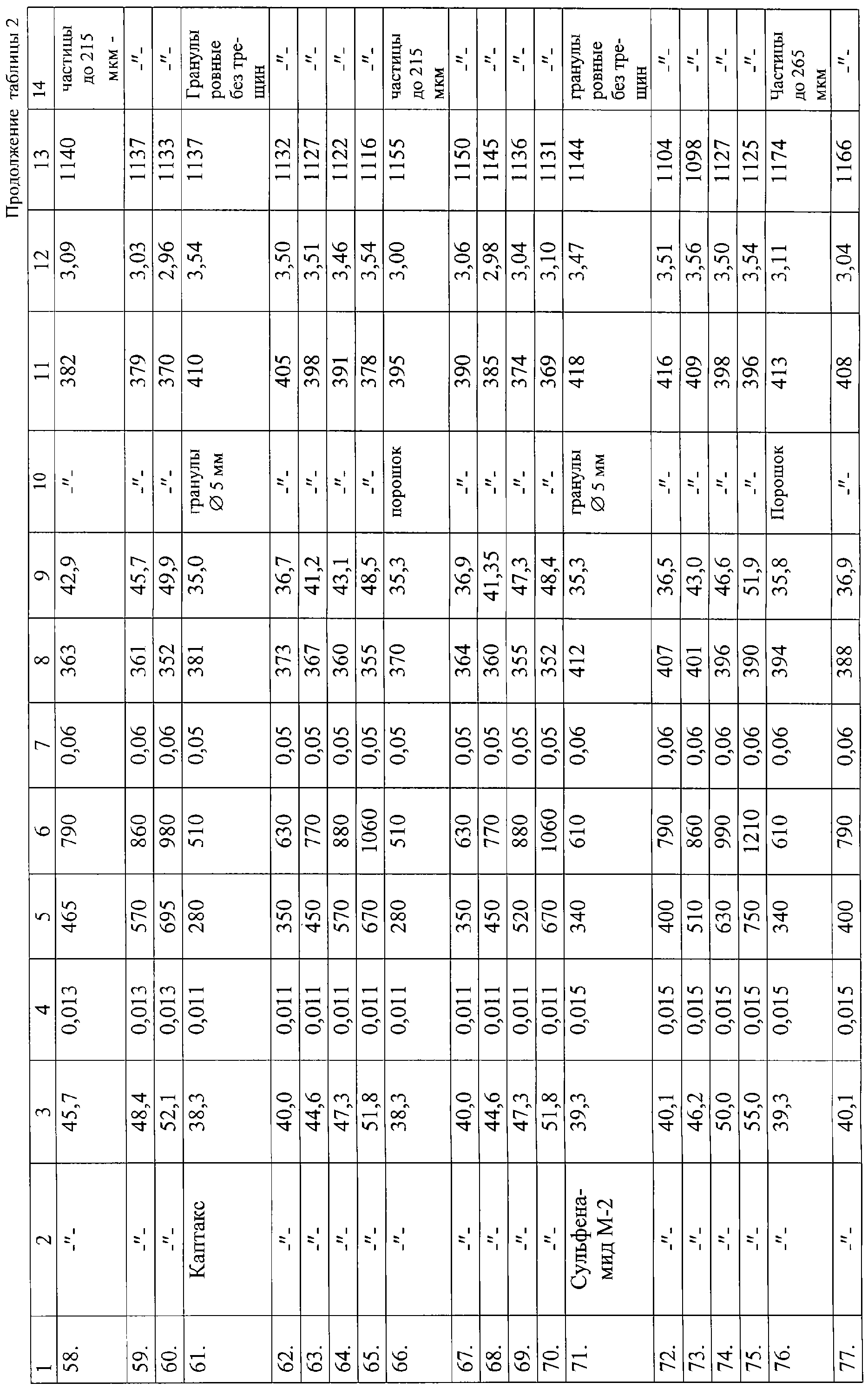 В примерах 41-80 таблицы 2 каждую порцию пастообразной массы раздельно пропускали через гранулятор после смешения пасты с сыпучим целевым продуктом насыпной плотности из порций 1-40 таблицы 2 и далее все действия в примерах 41-45, 51-55, 61-65, 71-75 таблицы 2, аналогично примерам 1-5, 11-15, 21-25, 31-35 таблицы 2, а в примерах 46-50, 56-60, 66-70, 76-80 таблицы 2 аналогично примерам 6-10, 16-20, 26-30, 36-40 таблицы 2.