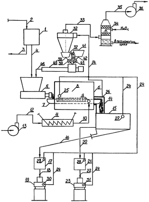 Установка работает следующим образом: перед началом процесса экструдирования предварительно включают вентилятор 13 для подачи атмосферного воздуха по линии 12, через камеру подогрева воздуха 11, откуда по линии 10 подогретый воздух поступает на вход 9 в межсеточное пространство транспортера 7 тоннельных камер 8 в конце конвективной сушилки 6 и вентилятор 36 для вывода в атмосферу очищенного от разных форм целевого продукта воздуха системой очистки через воздуховод 35, санитарную колонну 34, воздуховод 33, циклон 32 и воздуховод 24 из выхода 25 тоннельных камер 8 вначале сушилки 6, из схемы формирования 15 на выходе 27, из накопительных емкостей 17 и 21, через выходы 28 и 29 и из установок 19 и 23 через выходы 30 и 31. Включают транспортер 7. В бункер 41 засыпают сухую смесь целевого материала в виде отходов или порошка для работы в течение первого часа из расчета не менее 0,03 доли объема пастообразной массы, поступающей из вакуум-фильтра, с учетом часовой производительности экструдера. После прогрева системы и готовности устройства включают барабанный вакуум-фильтр 1, при этом линия 3 открыта для слива промывных вод, включают шлюзовый питатель 43, шнековый дозатор 45 и экструдер 5. Открывают линию 2 и подают водный раствор суспензии целевого продукта на барабанный вакуум-фильтр 1. Отфильтрованный и отжатый целевой продукт в виде пастообразной массы по линии 4 поступает в камеру смешения экструдера 5, куда одновременно по линии 46 из бункера 41 через патрубок 42, шлюзовый питатель 43 и дозатор 45 поступает сухая смесь отходов целевого продукта, смешивается с пастой, продавливается через фильерную решетку экструдера 5, и в виде жгута цилиндрических стержней укладываются на транспортную ленту 7 и затем поступают в конвективную сушилку 6, где в течение расчетного времени проходят цикл сушки и в конце сушилки 6 с транспортера 7 высушенный материал по вертикальному транспортному каналу 14 поступает на схему формирования 15, где в зависимости от потребительской потребности получают либо гранулы, либо порошок, которые по своим линиям поступают на фасовку в тару.