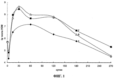 На фиг.1 отражена динамика численности УОМ в почве с нефтяным загрязнением в вариантах: 1 – агротехника; 5 – агротехника, удобрение и меласса; 8 – агротехника, меласса, удобрение и ПАВ.