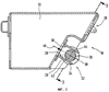 На фиг.2 плоскость, в которой лежат центральная ось 38 регулирующего расход элемента и малая ось эллипса, форму которого он имеет в поперечном сечении, перпендикулярна направлению 40 набегающего на него потока воды. В показанном на этом чертеже положении регулирующего расход элемента 36 проходное сечение соплового канала 26 в наименьшей степени сужено этим регулирующим расход элементом 36. При этом между регулирующим расход элементом 36 и нижней поверхностью 28 патрубка остается нижняя сопловая щель 42, а между регулирующим расход элементом 36 и верхней поверхностью 30 патрубка остается верхняя сопловая щель 44. Проходящая через обе эти сопловые щели 42, 44 вода выходит из патрубка 24 двумя плоскими струями.