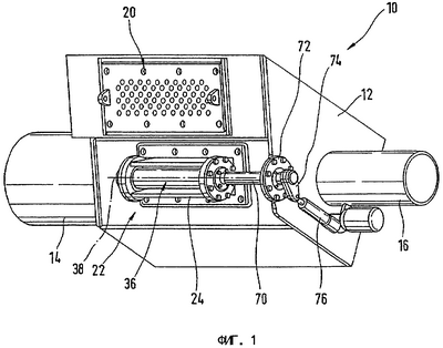 Позицией 70 на фиг.3 обозначен удлинительный вал, который насажен на опорную шейку 52 и жестко соединен с ней без возможности поворота относительно нее. Этот удлинительный вал 70 установлен с возможностью поворота во фланце 72, расположенном с наружной стороны водяного бака 12, и имеет по другую сторону от этого фланца рычаг (коромысло) 74. Этот рычаг соединен с линейным электроприводом 76 таким образом, что поступательное перемещение выходного приводного звена этого привода возвратно-поступательного действия преобразуется через рычаг 74 в поворотное движение регулирующего расход элемента вокруг его центральной оси. При этом максимальный угол такого поворота рычага должен быть не меньше 90° для возможности полного использования регулировочного потенциала регулирующего расход элемента 36, Необходимо отметить, что вполне допустимо использовать сравнительно маломощный привод 76, поскольку с учетом обтекаемой формы регулирующего расход элемента 36 и за счет его установки в подшипниках для преодоления действующей на него гидравлической силы (напора воды) требуется развивать лишь небольшие перестановочные крутящие моменты. Очевидно, что вместо линейного электропривода 76 можно также использовать пневмоцилиндр. Помимо этого для поворота регулирующего расход элемента 36 можно использовать и электропривод вращательного действия. В качестве такого электропривода вращательного действия можно также использовать, например, шаговый электродвигатель, который позволяет устанавливать регулирующий расход элемент в определенное угловое положение с такой же точностью, что и линейный электропривод 76.