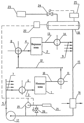 Если в процессе охлаждения доменной печи уровень воды в расширительном баке 18 снижается до первого рабочего уровня, то по команде датчика уровня воды 22 открывается клапан 20, и система пополняется водой от источника воды 21. Когда уровень воды в расширительном баке 18 снижается до второго рабочего уровня, то по команде датчика уровня воды 22 включается насос 19, и система пополняется водой от источника воды 21 до восстановления заданного уровня. Подпитка системы водой осуществляется во всасывающий коллектор циркуляционного насоса 17, а не в расширительный бак 18, что также упрощает конструкцию системы и ее эксплуатацию. Необходимое избыточное давление азота в расширительном баке 18 поддерживают, подавая азот от источника газа 23 в расширительный бак через клапан 24 по команде датчика давления газа 25.