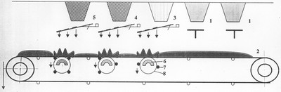 При выходе из зоны дозирования известняка шихта еще агитировалась в уменьшавшемся по амплитуде магнитном поле знакопеременной полярности и подавалась транспортером под дозатор бентонита, где повторялась та же операция.