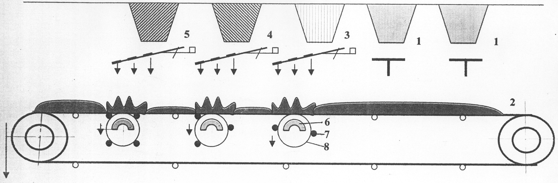 На движущуюся со скоростью 1 м/с конвейерную ленту подавался насыпным слоем 100-120 мм магнетитовый концентрат (92,5% крупностью класса минус 0,044 мм). В месте и в момент дозирования известняка установленной под лентой конвейера открытой разнополярной системой в слое магнетита создавалось магнитное поле с индукцией по высоте слоя от 0,3 до 0,1 Тл, что соответствовало индукции насыщения магнетита и обеспечивало максимальную длину магнитных прядей в слое и максимальную остаточную индукцию магнетита.