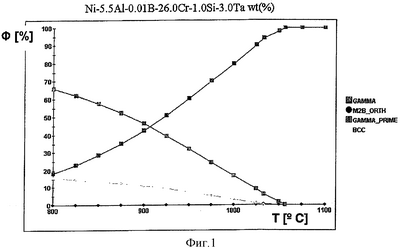 Как видно из фиг.1, взятый здесь состав не показывает или показывает лишь незначительные объемные доли -фазы и -NiAl-фазы или боридных фаз (на фиг.1 обозначены M2B_ORTH), так что при термоциклировании следует ожидать значительных преимуществ. Сравнительный сплав (фиг.2) показывает аналогичный состав у некоторых элементов, однако из-за отличий других элементов возникает совершенно иная микроструктура, которая, по нашему опыту, не будет обладать достаточной термоциклической стойкостью для турбины и к тому же не сможет использоваться из-за начинающегося при температуре выше 900°С расплавления.