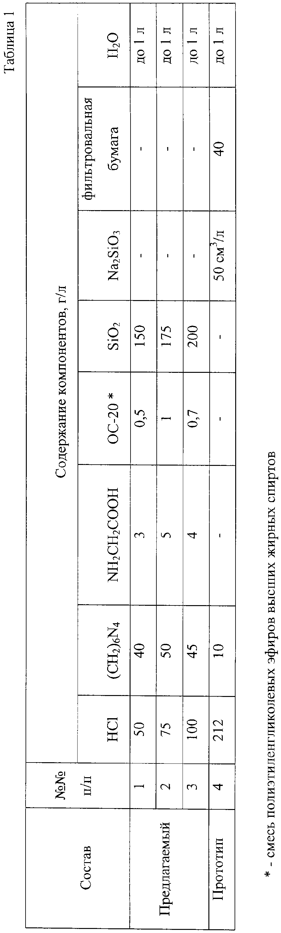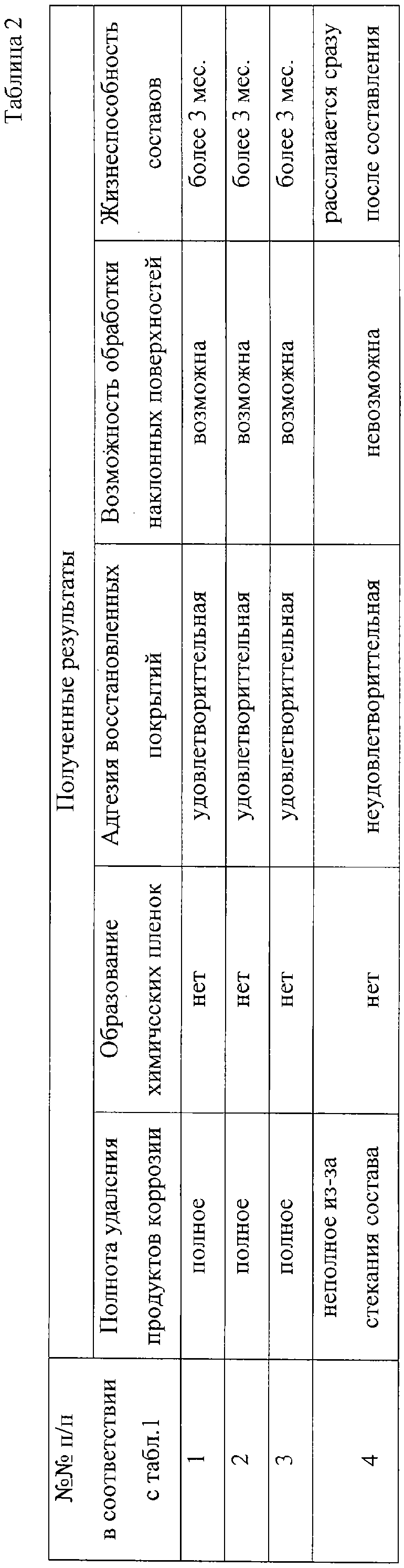 Предлагаемый состав отличается от известного тем, что введение в состав аминоуксусной кислоты, смеси полиэтиленгликолевых эфиров высших жирных спиртов и оксида кремния в определенном соотношении позволяет обеспечить эффективную и равномерную очистку поверхности от продуктов коррозии цинковых и кадмиевых покрытий и углеродистой стали без растравливания стали при меньшей в 2-4 раза концентрации соляной кислоты и получить устойчивую пасту с высокой вязкостью, которая хорошо удерживается на наклонных поверхностях. По нашему мнению, это обусловлено образованием устойчивых химических связей между компонентами состава. В отличие от пасты-прототипа, которая расслаивается сразу после приготовления, предлагаемая паста обладает длительной жизнеспособностью и сохраняет работоспособность более 3-х месяцев. Пример осуществления. В лабораторных условиях проведена обработка поверхности оцинкованных и кадмированных образцов из углеродистой стали с продуктами коррозии, полученными в камере солевого тумана. Обработка образцов проводилась предлагаемым составом и составом по прототипу. В таблице 1 представлены испытанные предлагаемый и выбранный в качестве прототипа составы для удаления продуктов коррозии с поверхности деталей из оцинкованной или кадмированной углеродистой стали. Оба состава наносились шпателем и выдерживались на поверхности до 2 часов. После снятия паст и протирки поверхности влажными тампонами визуально оценивалось состояние поверхности. В таблице 2 приведены результаты экспериментов по удалению продуктов коррозии цинкового и кадмиевого покрытий со стальных деталей. Как видно из таблицы 2, обработка предлагаемым составом позволяет полностью удалить продукты коррозии, исключив растравливание стальной поверхности и формирование на ней химических пленок, предлагаемая паста (примеры 1-3) не стекает с наклонной поверхности (примеры 1-3). Далее методом натирания на очищенную поверхность наносились защитные металлические покрытия. Методом нанесения сетки царапин была определена прочность сцепления восстановленных цинкового и кадмиевого покрытий (ГОСТ 9.302-88 ЕСЗКС. Покрытия металлические и неметаллические неорганические. Методы контроля). Установлено, что адгезия покрытий удовлетворяет требованиям ГОСТ (табл.2). Обработка пастой-прототипом (пример 4) удаляет продукты коррозии только частично из-за расслоения и отекания состава с наклонной поверхности, что приводит к неудовлетворительной адгезии нанесенных методом электронатирания покрытий. Таким образом, предлагаемый состав позволяет эффективно удалять продукты коррозии с оцинкованных и кадмированных стальных деталей из углеродистой стали и обеспечивает удовлетворительную адгезию защитных покрытий при их ремонте. Кроме того, предлагаемый состав менее агрессивен (концентрация соляной кислоты в 2-4 раза меньше по сравнению с прототипом), может применяться как при изготовлении крупногабаритных деталей без погружения их в ванны, так и при ремонте покрытий на ремонтных базах.