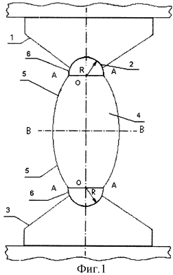 Устройство состоит из верхней подушки 1 опоры моста, представляющей собой монолитную перевернутую призму, одна грань которой представляет собой вогнутую цилиндрическую поверхность 2 радиуса R. Нижняя подушка 3 опоры моста представляет собой призму, симметричную призме верхней подушки 1 опоры моста относительно горизонтальной плоскости ВВ. Монолитный каток 4 опоры выполнен в форме двух имеющих общую плоскость симметрии ОО, обращенных друг к другу параболических полуцилиндров 5, усеченных фокальными плоскостями АА, перпендикулярными плоскости симметрии ОО катка 4 и плоскости рисунка, переходящими по линии сечения фокальными плоскостями АА в прямые круговые полуцилиндры 6, на которые шарнирно опираются верхняя 1 и нижняя 3 подушки. Фокальная ось параболического полуцилиндра 5 и ось полуцилиндра 6 как в верхней, так и в нижней части тела катка совпадают, они перпендикулярны плоскости рисунка и пересекают ее в точках О и О. Значение радиуса кривизны R цилиндрической поверхности определяется условием R=1/2a, где а – коэффициент в уравнении параболы у=ах2, являющейся линией пересечения параболического полуцилиндра 5 и плоскости рисунка. Горизонтальная плоскость симметрии ВВ – суть плоскость, которую образуют совпадающие задние поверхности параболических полуцилиндров 5.