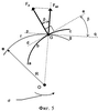 На фиг.6 показано построение поверхности лопатки, разворачивающейся на плоскость. Oz – ось вращения ротора 2. xOy – плоскость, перпендикулярная оси Oz вращения ротора 2. О – точка пересечения оси Oz вращения ротора 2 с плоскостью хОу. В плоскости хОу введена система полярных координат, причем полюс этой системы координат совпадает с точкой О, а полярная ось совпадает с положительной полуосью оси Ох, направленной влево. В качестве положительного направления поворота радиуса-вектора, задающего положение точки в указанной полярной системе координат, принято направление вращения по часовой стрелке.