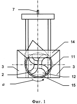 Направляющие щитки 3 – участки конической поверхности. Ось этого конуса совпадает с осью OO1 на фиг.2. Направляющий щиток 14 делается съемным для обеспечения возможности монтажа ротора.