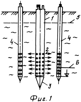 Вокруг каждого перфорированного трубчатого элемента 4 создают зону с пониженным давлением. Для этого к верхнему открытому концу перфорированного трубчатого элемента 4 присоединяют горизонтальный трубопровод, по которому происходит подача сжатого воздуха, например, от того же самого компрессора, который используется для нагнетания сжатого воздуха в инъектор 1. Тем самым создается эффект пульверизатора и внутри перфорированного трубчатого элемента 4 возникает разрежение. Производится подача сжатого воздуха в инъектор 1 с давлением, превышающим давление от собственного веса вышележащего грунта на отметке 6. Величины давления воздуха в инъекторе 1 и разрежения в перфорированных трубчатых элементах 4 должны быть определены расчетом и могут быть проверены результатами испытаний для каждого слоя закрепляемого грунта. При этом происходит отжатие воды из пор грунта.
