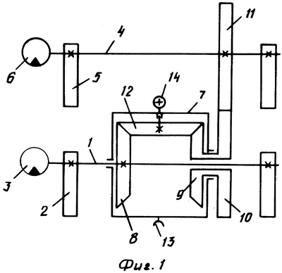 Гидромоторы 3 и 6 вращают соответственно валы 1 и 4 с дебалансами 2 и 5. Дифференциал обеспечивает синхронизацию вращения валов 1 и 4 за счет того, что конические шестерни 8 и 9, находясь в зацеплении с конической шестерней 12, вращаются с одинаковой частотой в разные стороны.