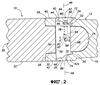 Для целей, описанных далее в этом документе, участок 42а боковой стенки (фиг.2) имеет внутреннюю боковую выемку, которая образует на участке 42а боковой стенки внутреннюю боковую опорную поверхность 50, поперечную оси 48 и обращенную к области 30 кармана. Дополнительно, что также показано на фиг.2, внутренняя боковая поверхность отверстия 44 боковой стенки имеет проходящую по окружности выемку 52, образованную внутрь от поверхности наружной стороны боковой стенки 40. Выемка 52 открывается внутрь, в карман 30, и имеет (на ее верхней стороне, как видно на фиг.2) опорную поверхность 54, поперечную оси 48.