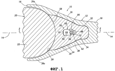 Как показано на фиг.1 и 2, наконечник 12 зуба имеет вогнутый участок 28 поверхности заднего конца, через который карман 30 проходит вперед во внутреннюю часть наконечника 12 зуба. Как лучше всего видно на фиг.1, от своего переднего входа в наконечник 12 зуба через изогнутый участок 28 поверхности заднего конца карман 30 сужается вперед и вертикально внутрь и имеет уменьшенное сечение, стабилизирующее передний концевой участок с обычно горизонтальными противоположными участками 32 и 34 поверхностей верхней и нижней сторон.