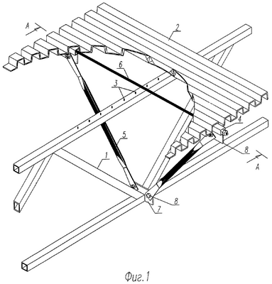 На нижний пояс решетчатой конструкции 1 устанавливают накладной элемент 7. К накладному элементу 7 и связевым элементам 4 при помощи болтов 8 крепят подкосы 5, при этом левый и правый связевые элементы 4 стягивают затяжкой 6, выполненной в виде сквозного болта.