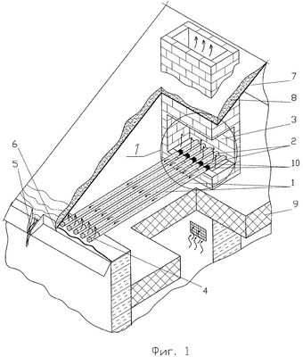 На фиг.3 – увеличенная выноска 1 из фиг.1 (зоны испарения тепловых труб с водяным теплообменником системы отопления здания).