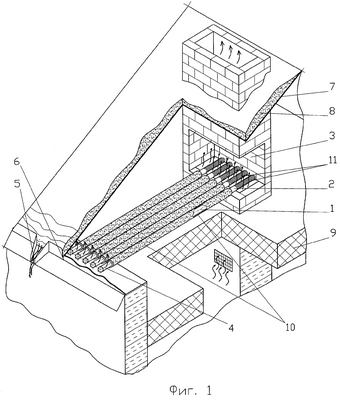 Теплый воздух из помещения здания через вентиляционные отверстия поступает в вентиляционный канал (воздуховод) 3 вытяжного воздуха. Двигаясь по воздуховоду 3, воздушные потоки омывают эллиптические с оребрениями 11 зоны испарения 2 тепловых труб 1, которые обладают небольшим аэродинамическим сопротивлением и высоким коэффициентом теплопередачи. Поглощенная теплота в зоне испарения 2 передается в зону конденсации 4 тепловых труб 1, где впоследствии она передается участкам кровли путем теплопроводности и конвекции. Потери теплоты в тепловых трубах 1 между зонами испарения 2 и конденсации 3 сведены к минимуму теплоизоляцией 10. В результате подвода теплоты к желобам 6 и водостокам 5 крыши 7 происходит таяние образовавшихся на них ледяных валиков, наледи и сосулек. Таким образом, путь стока талой воды остается свободным в любое время и при любой температуре воздуха.