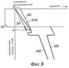 Где Р – давление, – плотность раствора, ПВГ – полная вертикальная глубина скважины, С – противодавление. Согласно примеру гидростатического давления 302 плотность имеет значение плотности воды. В открытой системе противодавление С нулевое. Чтобы обеспечить превышение давления 303 в кольцевом пространстве по сравнению с поровым давлением 300 формации, раствор утяжеляют, тем самым увеличивая давление по мере увеличения глубины. Профиль 300 порового давления согласно фиг.7 является линейным до выхода из обсадной трубы 301, и в этом случае на него воздействует фактическое пластовое давление, в результате чего происходит резкое увеличение давления. Во время обычных операций вязкость раствора можно подобрать с таким значением, чтобы давление 303 в кольцевом пространстве превышало поровое пластовое давление ниже обсадной трубы 301.