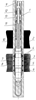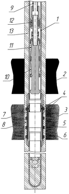 Далее колонну труб 9 с находящимися на ее конце замковым механизмом и пакерующим устройством 12 извлекают из колонны обсадных труб 1, а каналы 4 обсадной колонны труб 1 остаются герметично перекрытыми заслонкой 7, исключая депрессию на водоносную часть 3 продуктивного пласта 2 в процессе последующего освоения скважины, которая может привести к обводнению продукции за счет образования водяного конуса. Процесс разобщения водоносной части продуктивного пласта 2 завершен.
