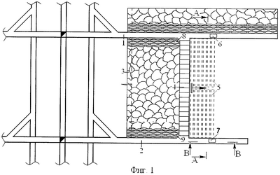 фиг.1 – проекция на горизонтальную плоскость способа разработки пластов малой и средней мощности по простиранию с оставлением породы в шахте;