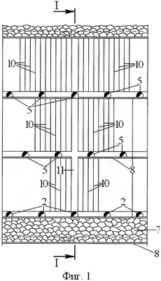где Lp – длина рампы, приходящаяся на 1 м длины подготавливаемого участка, м; Sp – сечение выработок рамы, м2; p – коэффициент разрыхления пород; Sпэ – сечение выработок подэтажей, м2; nпэ – количество выработок подэтажей, приходящихся на 1 м длины камеры; nз – число заездов, приходящихся на 1 м длины камеры (участка залежи); S’з – сечение заезда, м2; lз – длина заезда, м; hпод – высота подсечки, м. После проходки уклона и рудного штрека, образования камерной или камерно-столбовой системой камеры 7 ниже уровня основного горизонта на ее почву настилается металлическая сетка 8, которая предназначается для предотвращения разубоживания породой руды нижележащего этажа. После этого начинается проходка всех полевых выработок и складирование пород от их проходки в камеру ниже основного горизонта. После проведения рампы и заездов на каждом подэтаже на всю мощность рудного тела и на всю длину участка рудного тела проходят сплошные подсечки 9, как на основном горизонте, так и на подэтажах. Из них разбуривают параллельными скважинами 10 основные запасы подэтажей. Перед взрыванием скважин на почву верхней подэтажной камеры настилается металлическая сетка для защиты руды каждого нижеследующего подэтажа при выпуске. Для отбойки запасов на каждом подэтаже проходят один или несколько отрезных восстающих 11, разделывают их в отрезные щели и затем отбивают основные запасы подэтажей. Выпуск руды осуществляют через торцы заездов на каждом подэтаже, начиная с верхнего. Предлагаемый способ позволяет применять на всех видах работ мощное и производительное буровое и погрузочно-транспортное оборудование, повысить интенсивность подготовки и отработки запасов, увеличить производственную мощность рудника, свести до минимума потери и разубоживание руды и резко повысить эффективность разработки рудных залежей.