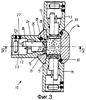 Вилочное устройство 10 состоит из имеющей, по существу, форму куба основной части 14, на трех из четырех боковых стенках 15 которой закреплены по одной соединительной муфте 11, 12, 13. Нижняя сторона 16 основной части 14 закрыта, и на противоположной ей верхней стороне имеется выполненная полой крепежная втулка 18, которая по внешнему периметру имеет винтовую резьбу 19. На винтовую резьбу 19 крепежной втулки может быть навинчена крепежная гайка 40, чтобы, как это хорошо видно на фиг.4, зафиксировать вилочную часть 10 на нижней стенке 1 устройства индивидуального управления, при этом крепежная втулка 18 обеспечивает доступ через нижнюю стенку. Чтобы защитить от попадания влаги внутреннее пространство устройства индивидуального управления, в котором находится микроэлектроника, основная часть 14 на своей верхней стороне имеет упорный буртик 17, над которым вверх выдается крепежная втулка 18, и который у основания крепежной втулки 18 снабжен приемной канавкой 42 для кольцевого уплотнения 43. Это установленное в упорном буртике 17 кольцевое уплотнение 43 прижимается при затягивании винта 40 к внешней стороне нижней стенки 1 корпуса и уплотняет при этом проходное отверстие в нижней стенке 1 для крепежной втулки 18. Между гайкой 40 и нижней стенкой 1 предпочтительно устанавливается подкладная гайка 41. Чтобы исключить ошибки при монтаже и закрепить без проворачивания вилочное устройство 10 на нижней стенке 1, крепежная втулка 18 имеет, как это можно видеть на фиг.2, лыску 20, которая взаимодействует с ответной лыской в проходном отверстии в нижней стенке 1 (фиг.4) таким образом, что крепежная втулка 18 только при повернутом положении вилочного устройства 10 может быть полностью вдвинута в проходное отверстие. При этом одновременно с помощью лысок 20 благодаря геометрическому замыканию осуществляется установка без проворачивания вилочного устройства 10 на нижней стороне 1.