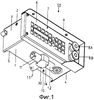 На фиг.1-4 представлено устройство 50 индивидуального управления согласно изобретению с расположенным на нижней стороне 1 вилочным устройством 10 с тремя соединительными муфтами 11, 12, 13. Устройство 50 индивидуального управления согласно изобретению, как известно, служит для электрогидравлического управления исполнительными механизмами в виде электромагнитов, которые управляют работой гидравлических поршней и цилиндров секций механизированной крепи (не показано), или с их помощью снимаются показания датчиков, приданных отдельным гидравлическим агрегатам, и/или для выполнения других задач управления. Устройство 50 индивидуального управления включает корпус в виде плоского ящика с нижней стенкой 1, верхней стенкой 2, двумя боковыми стенками 3, 4, задней частью 5 и передней частью 6. На съемной передней части 6 расположен под общей позицией 7 пульт управления, хорошо доступные для пользователя аварийный выключатель 8А и стопорный выключатель крепи 8В. С помощью клавиатуры 7 может осуществляться непосредственное управление работой секцией крепи, и индивидуальное управляющее устройство закреплено на нижней стороне перекрытия секции. В показанном примере выполнения передняя часть 6 устройства 50 индивидуального управления закреплена с помощью винтов на корпусе, выполненном путем штамповки из стального листа, вся микроэлектроника, размещенная в корпусе (не показана), включая плату дисплея, плату процессора и плату интерфейса, соединена со съемной передней частью 6. Передняя часть 6 устройства 50 индивидуального управления снабжена выступающим вперед козырьком 9 для защиты пульта 7 и выключателей 8А и 8В. Кабели, связывающие исполнительные механизмы и сенсорные датчики на секции механизированной крепи, могут иметь вход в не показанный штекерный соединитель на задней стороне 5 корпуса устройства 50 индивидуального управления.